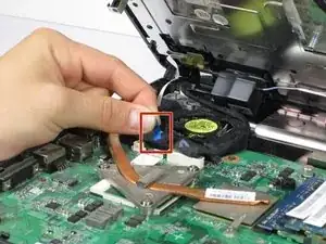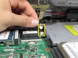 Поднимите голубую пластиковую вкладку, соединённую с белой полоской, чтобы отсоединить панель клавиатуры от материнской платы.