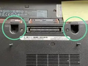 После удаления аккумулятора вы можете удалить два винта рядом с разъёмом док-станции (зелёные круги).