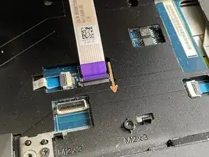 Чтобы вытащить ленточный кабель, нужно поднять пластиковый рычаг сверху в направлении оранжевой стрелки.