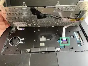 Аккуратно поднимите клавиатуру, так как она всё ещё соединена ленточным кабелем. (зелёный прямоугольник)