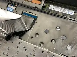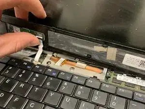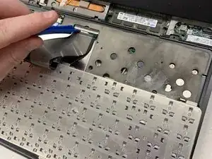 Отключите ленточный кабель, соединяющий клавиатуру с ноутбуком, подняв белую фиксирующую планку на ZIF-разъёме.