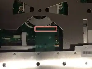 Ленточный кабель расположен в верхнем левом углу и должен быть аккуратно отсоединён от материнской платы, как показано в следующем шаге.