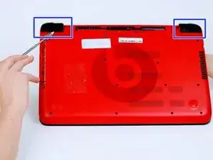Снимите резиновые ножки, расположенные на левой и правой стороне компьютера, чтобы открыть скрытые винты размером 8 мм.