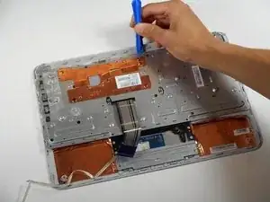 Пластиковым инструментом для вскрытия отсоедините клавиатуру от её крепления, поддевая по периметру.