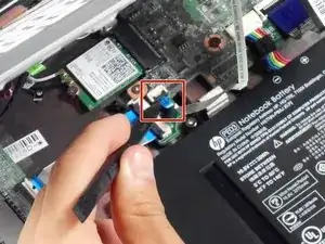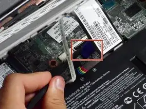 Воспользуйтесь лопаткой, чтобы открыть два фиксатора разъёмов ZIF, к которым подключены гибкие кабели от крепления клавиатуры к материнской плате.