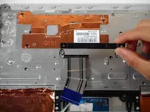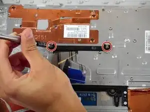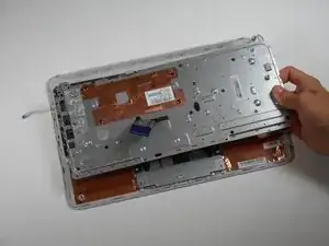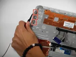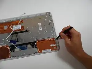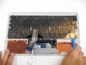 Пинцетом отогните три полоски ленты металлического цвета в верхнем левом углу крепления клавиатуры.
