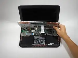 Поднимите крепление клавиатуры и извлеките его из ноутбука.