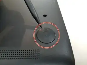 Удалите четыре крупных резиновых крепления с нижней части устройства, чтобы открыть доступ к винтам, используя заостренный конец лопатки.