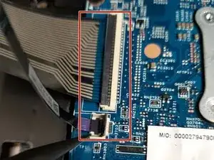 Отключите два шлейфа, соединенные с материнской платой, используя заостренный конец лопатки, чтобы поднять пластиковые замковые крышки, позволяя аккуратно удалить шлейфы вручную.