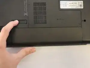 Убедитесь, что ноутбук полностью выключен, затем переверните его, чтобы найти замок батареи, расположенный внизу задней панели.