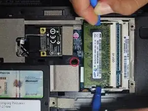 Посередине нижней части компьютера между оперативной памятью и антеной Wi-Fi находится четвертый винт клавиатуры, который также необходимо удалить.