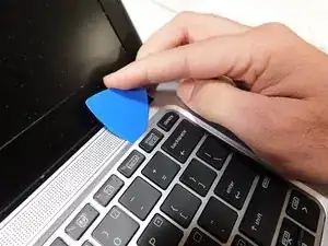 Используйте пластиковую лопатку iFixit, чтобы осторожно приподнять верхнюю часть клавиатуры.