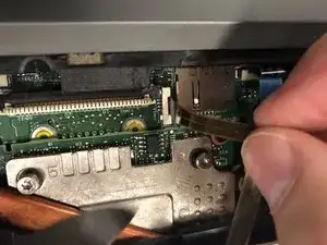 Как и на предыдущих шагах, используйте инструмент, чтобы поддеть основу вверх и слегка приподнять её, ослабив захват серебристого ленточного кабеля.