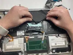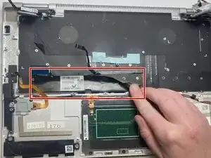Поднимите чёрный гибкий шлейф, прикреплённый к задней стороне клавиатуры, чтобы открыть скрытые винты.