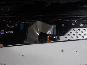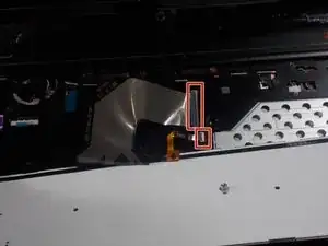 Поднимите два серых язычка, удерживающие шлейф в разъёме. Затем снимите клавиатуру.