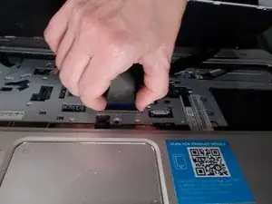 Отпустите шлейф соединителя клавиатуры (широкий шлейф) подняв тонкий край, лежащий на верхней части шлейфа.