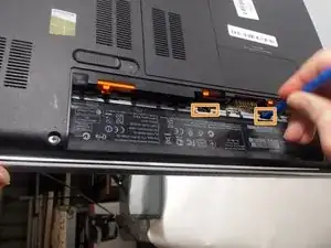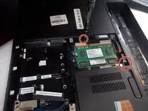 После снятия аккумулятора необходимо убрать нижнюю крышку. Снимите крышку с компьютера. Есть два винта, которые нужно открутить, чтобы освободить клавиатуру. Вам потребуется пластиковый инструмент для поддевания, чтобы выталкивать клавиатуру. Осторожно отсоедините два шлейфа, соединяющих клавиатуру с ноутбуком, после чего можно снять клавиатуру.