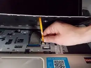 Отключите более тонкий шлейф подсветки клавиатуры от системной платы, осторожно потянув за вкладку.
