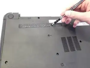 Теперь найдите и открутите два винта Philips №1 длиной 4 мм с символом клавиатуры, расположенные ближе к середине и верхней части нижней стороны ноутбука.