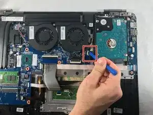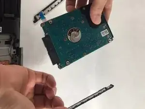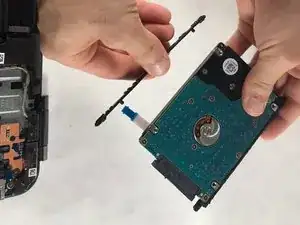 С помощью инструмента для вскрытия поднимите фиксатор, удерживающий ленточный кабель жёсткого диска в разъёме устройства.