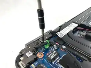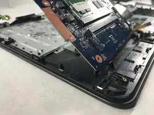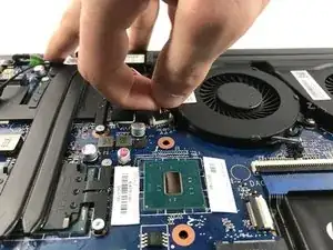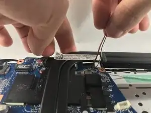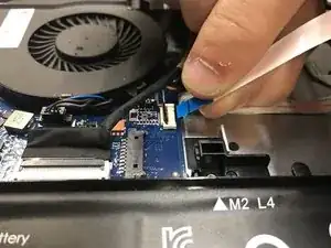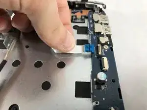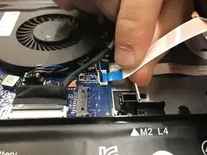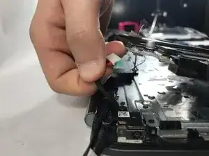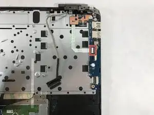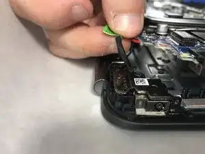 Снова приподнимите заднюю часть материнской платы и извлеките адаптер зарядки.