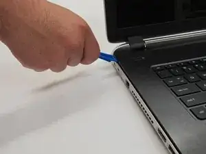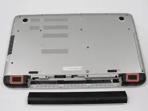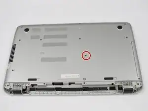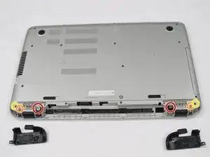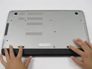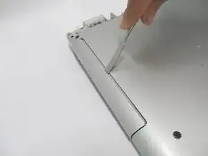 Переверните ноутбук. Затем, с открытым ноутбуком, проведите пластиковым инструментом по крышке сверху, чтобы поддеть её и отжать от корпуса.