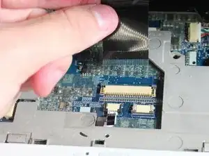 Под клавиатурой проходит плоский кабель, соединяющий клавиатуру с компьютером. Пока не снимайте клавиатуру полностью — сначала необходимо отсоединить этот кабель. Если тянуть клавиатуру слишком сильно, кабель может порваться.