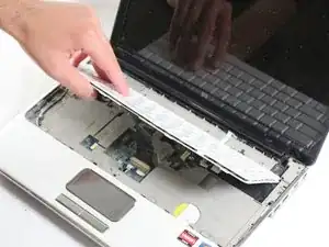 Осторожно приподнимите клавиатуру со стороны, ближайшей к вам, откинув её от себя. Пока не снимайте клавиатуру полностью, поскольку необходимо отсоединить кабель.