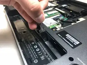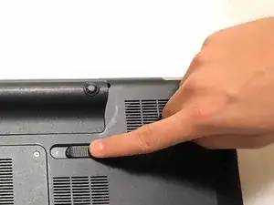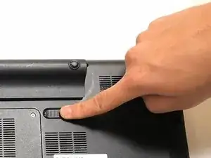 Сдвиньте переключатель разблокировки аккумулятора влево. Затем аккумулятор выпрыгнет.