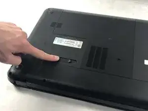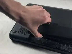 Поместите палец на ползунок фиксатора батареи, нажмите в сторону центра ноутбука, чтобы разблокировать батарею.