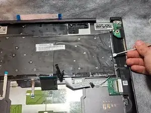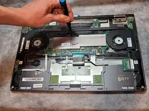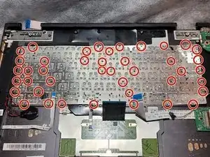 Используйте крестовую отвертку Phillips #00, чтобы отвинтить сорок два винта 2 мм из клавиатуры, затем выньте её из корпуса ноутбука.
