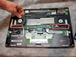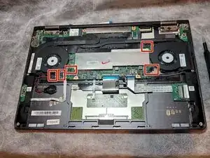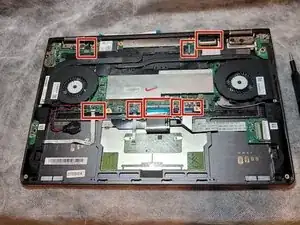 Глядя на заднюю часть ноутбука, в правом верхнем углу находятся два ZIF-разъёма (один уже должен быть отключён при снятии SSD), в левом верхнем — один, и пять внизу. Обозначены красными квадратами.