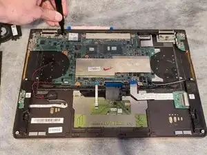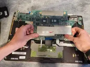 Снимите материнскую плату. Сначала поднимите правую сторону, затем выньте её.