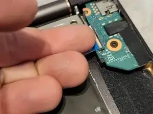 С минимальным усилием поднимите фиксирующие планки на ZIF-разъёме платы USB с помощью пластикового инструмента для вскрытия или ногтя и вытащите ленточный кабель.