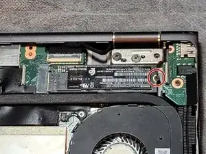 Снимите винт Phillips #1 3 мм, который крепит твердотельный накопитель к плате.