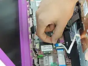 Поднимите фиксирующие защёлки на ZIF-коннекторах, удерживающих два ленточных кабеля клавиатуры.