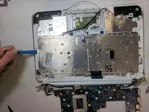 Используйте синий пластиковый медиатор, чтобы приподнять серебристую крышку клавиатуры.