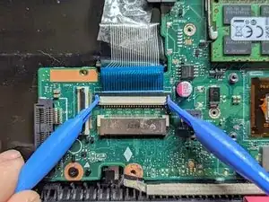 Возьмитесь за ленточный кабель за синюю вкладку и потяните прямо из разъёма.