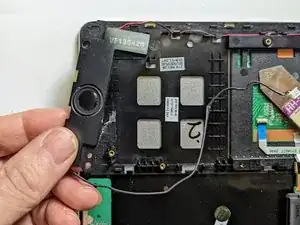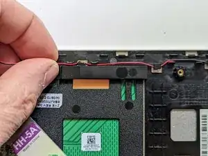Между динамиками и корпусом ноутбука используется довольно сильный клей, требующий значительных усилий при разборке. Работайте медленно и осторожно рядом с тонкими проводами, соединяющими два динамика.