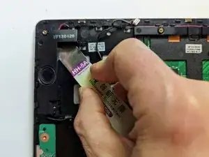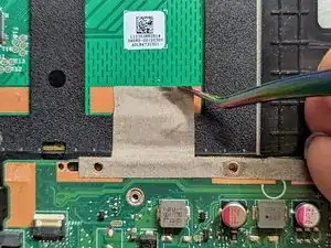 Снимите чёрную ленту, фиксирующую ленточный кабель клавиатуры к разъёму дисплея.