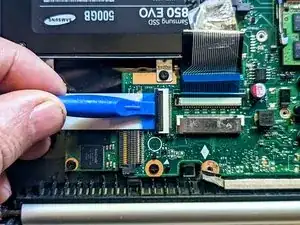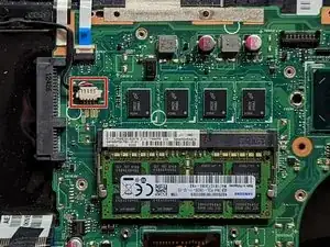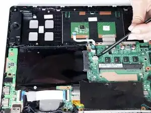 С помощью лопатки приподнимите разъём, соединяющий аккумулятор с материнской платой.