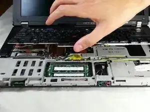 Поднимите передний край клавиатуры пальцами, пока не увидите провод, который её соединяет.