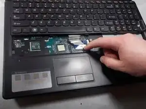 При поднятии клавиатуры нажмите вперёд чёрный фиксатор на ZIF-разъёме кабеля клавиатуры, чтобы разблокировать его.