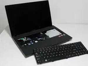 Удалите три винта на нижней стороне корпуса. Рядом с ними изображена маленькая клавиатура. Если вы не сделаете это в первую очередь, клавиатура не снимется. Поместите пластиковую лопатку прямо под край клавиатуры и поднимите клавиатуру.