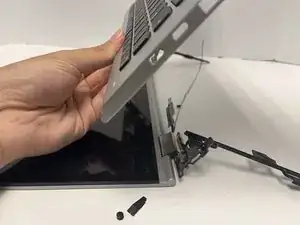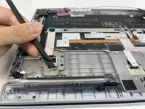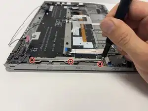 Используйте отвертку Phillips №0, чтобы выкрутить два винта длиной 2,5 мм на металлической пластине в центре клавиатуры.