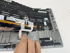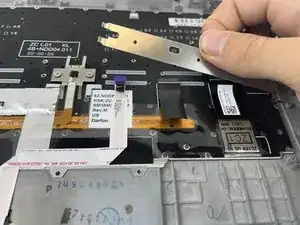 Осторожно потяните за чёрный фиксатор, чтобы вынуть ленточный кабель с задней стороны клавиатуры.