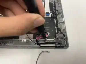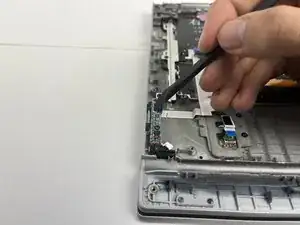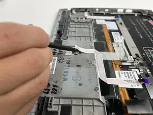 Используйте пластиковую лопатку, чтобы отжать ленту-кабель, идущую от верхней средней части аккумулятора, из разъёма на материнской плате.