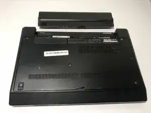 Удалите аккумулятор, перевернув ноутбук и нажав два зажима внутрь, затем отложите в сторону.