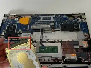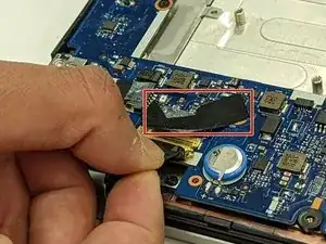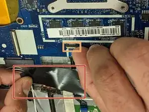 Поднимите две полоски скотча. Аккуратно отведите разъём кабеля назад, чтобы вынуть его с материнской платы.