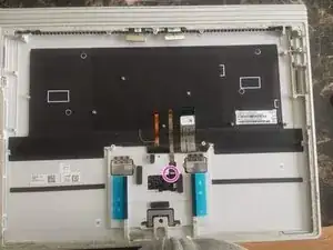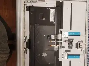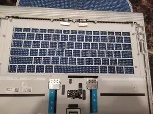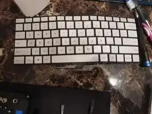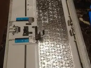Используя пластиковый скальпель (очень важно, чтобы он был пластиковым) и изопропиловый алкоголь, возможно, зубную щетку для помощи, аккуратно отлепите черную клейкую обратную подсветку от клавиатуры.